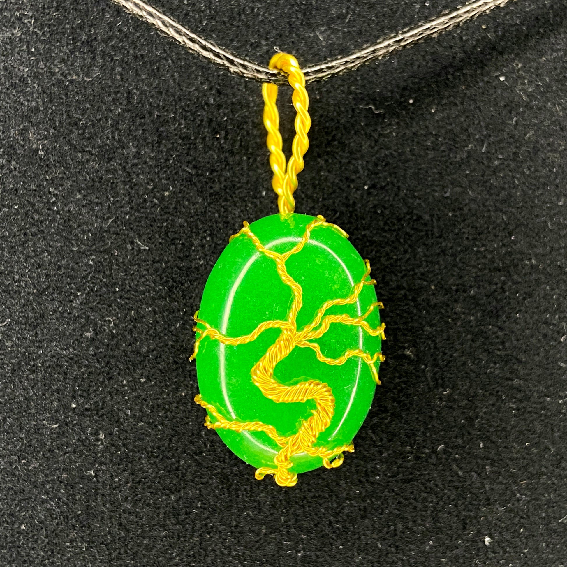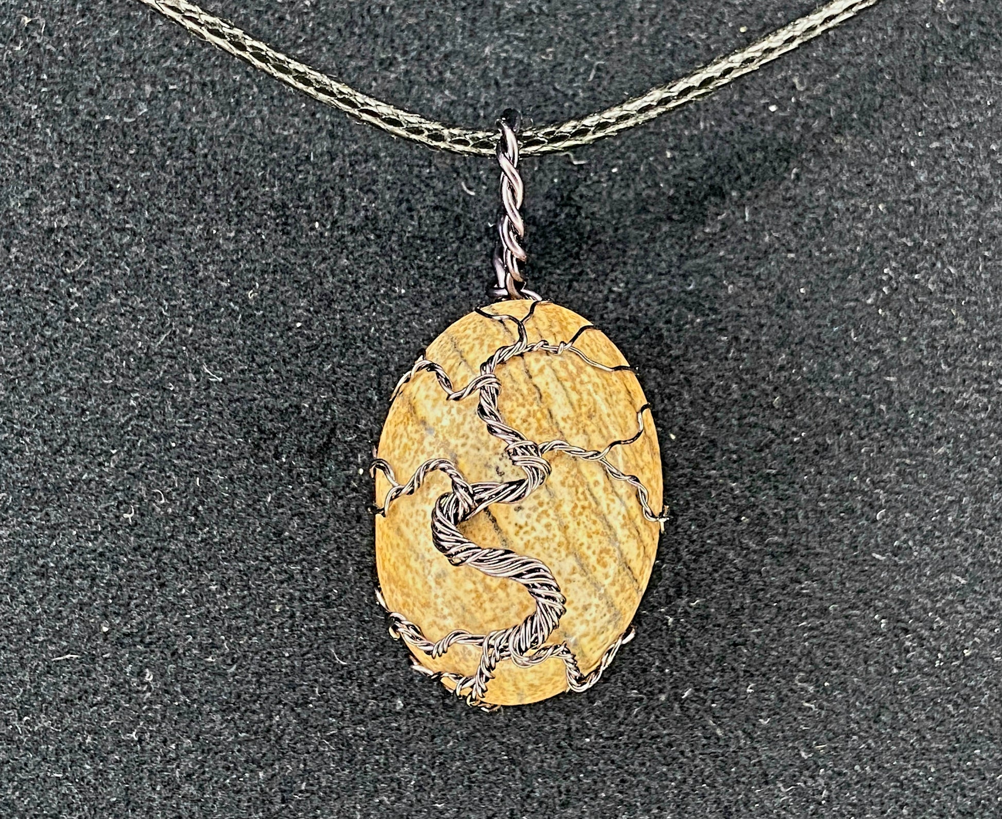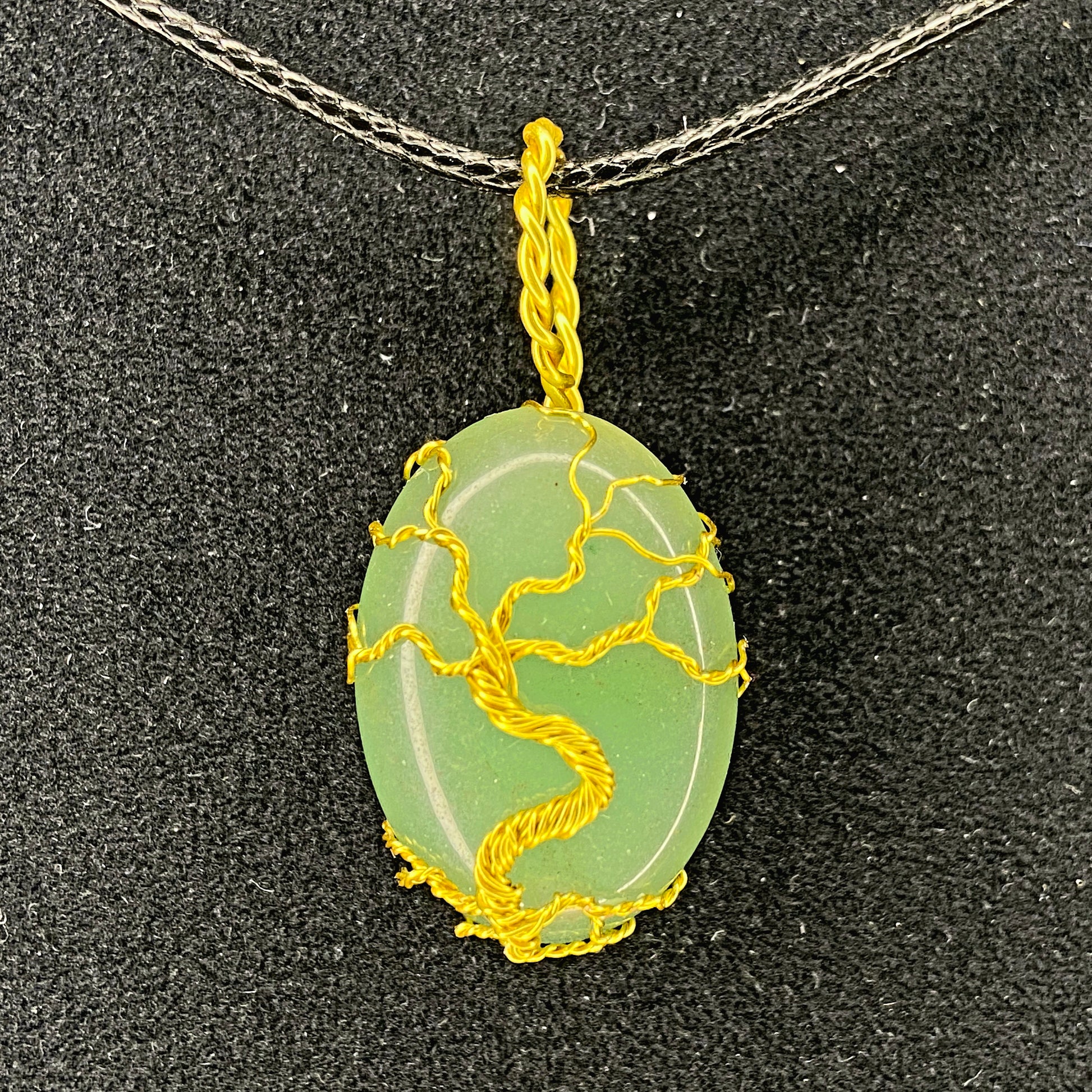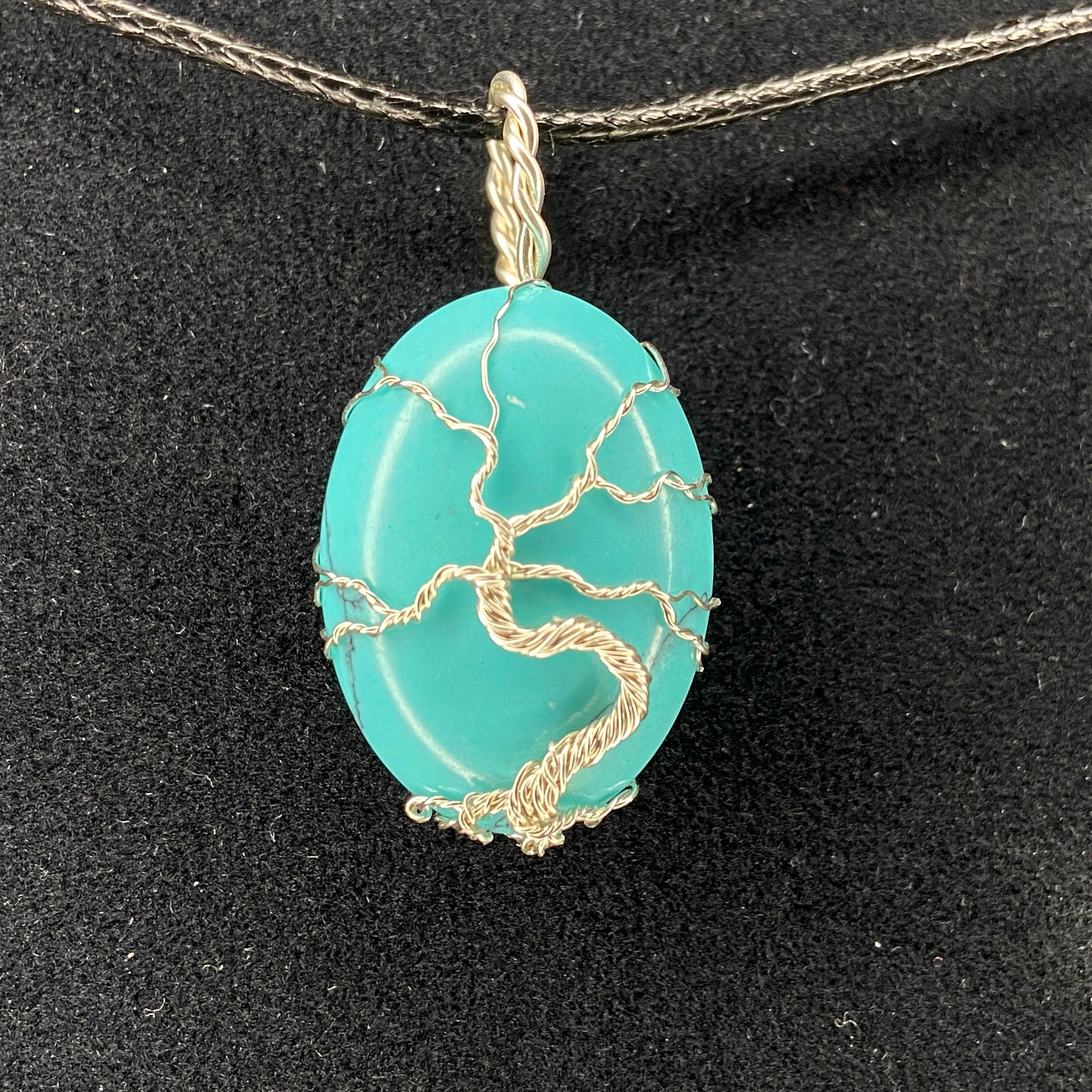 Pendentif fabriqué à la main, cabochon de pierre naturelle de 25 X 18 mm, fil anti-ternissement. Collier en corde noire inclus.