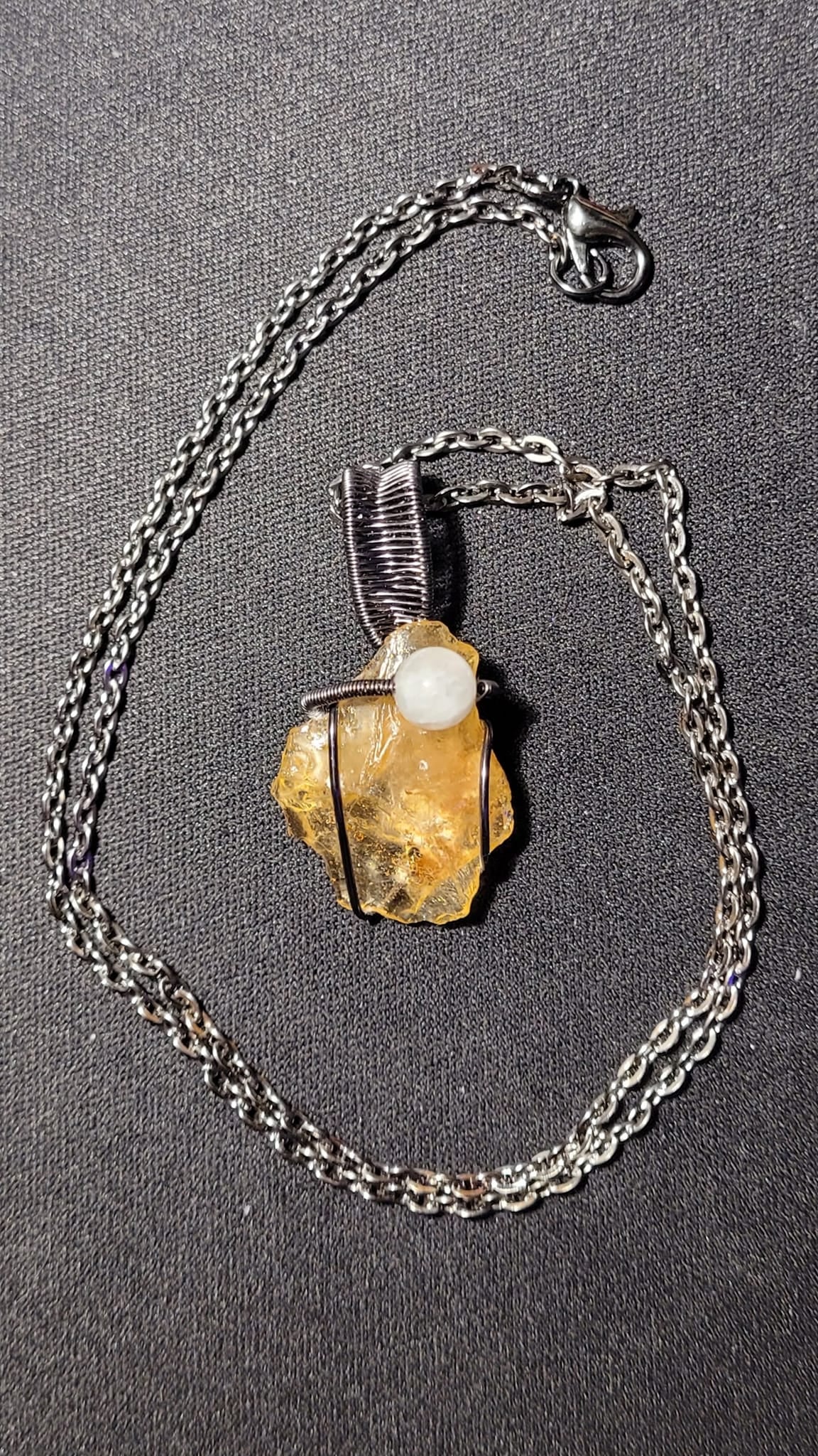Pendentif fabriqué à la main, ambre et perle de pierre de lune naturelles, fil de métal noir "gunmetal" anti-ternissement. Chaîne assortie incluse.